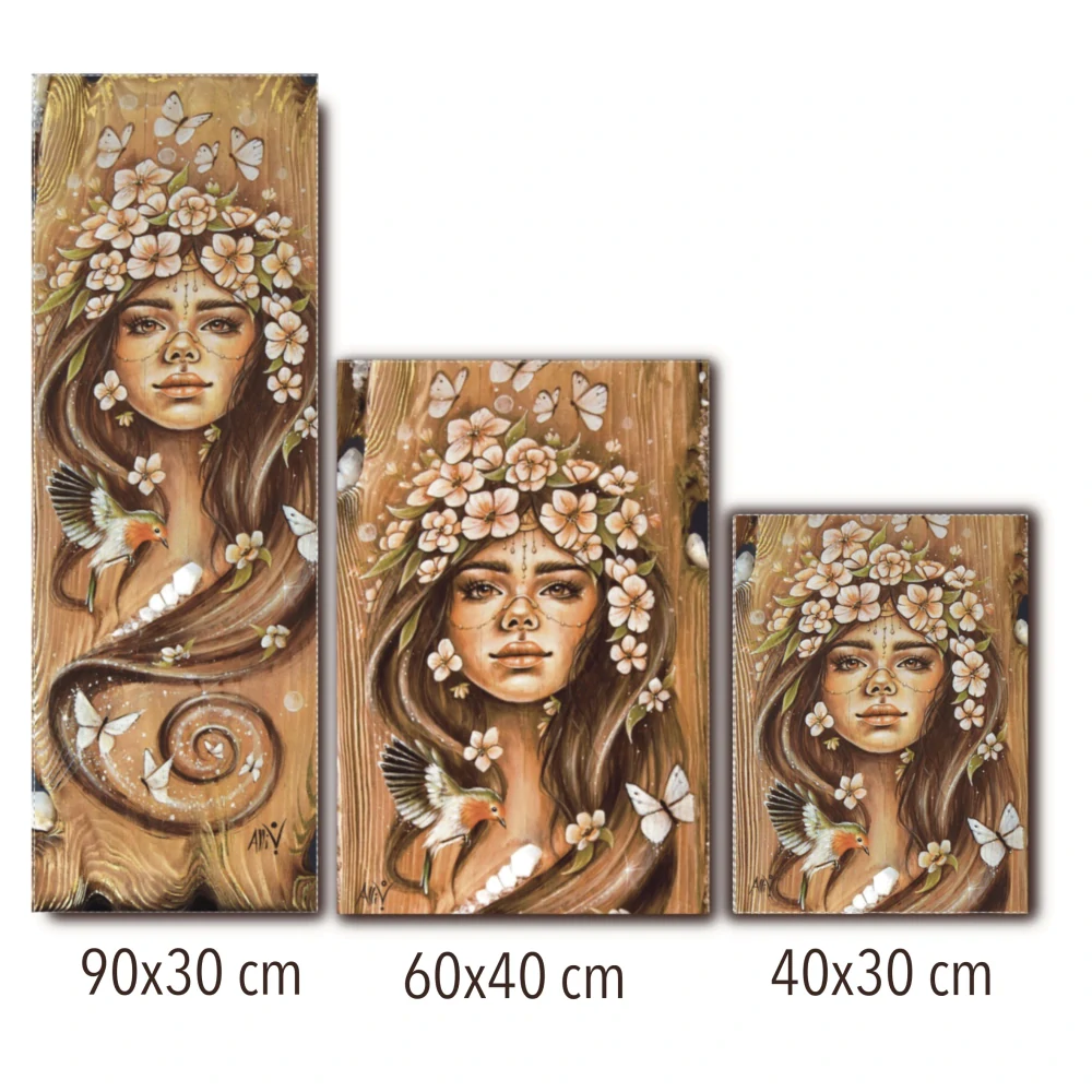 Tento obraz je inspirován jemností, krásou a harmonií, kterou jaro přináší. Na dřevěném podkladu je zachycena žena s květy ve vlasech, obklopená motýly, kteří symbolizují radost, lehkost a kouzlo tohoto období.