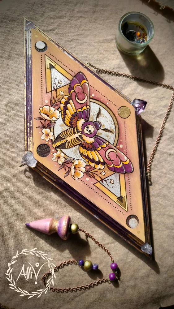 Každý kerb začíná autorskou kresbou, kterou převádím do gravírovacího laseru. Ten motiv přesně vypálí do dřevěné destičky a vytvoří detailní reliéf. Následně destičku ručně vymalovávám akrylovými barvami a dále ji zdobím metalickými plátky zlata a stříbra, které dodávají motivu hloubku a jemný lesk. Do hotového obrazu vsazuji přírodní minerály, které doplňují energetický charakter celého díla. Součástí je také dřevěné kyvadlo z bukového dřeva, které ručně vyřezáváme na soustruhu a zavěšujeme na řetízek.