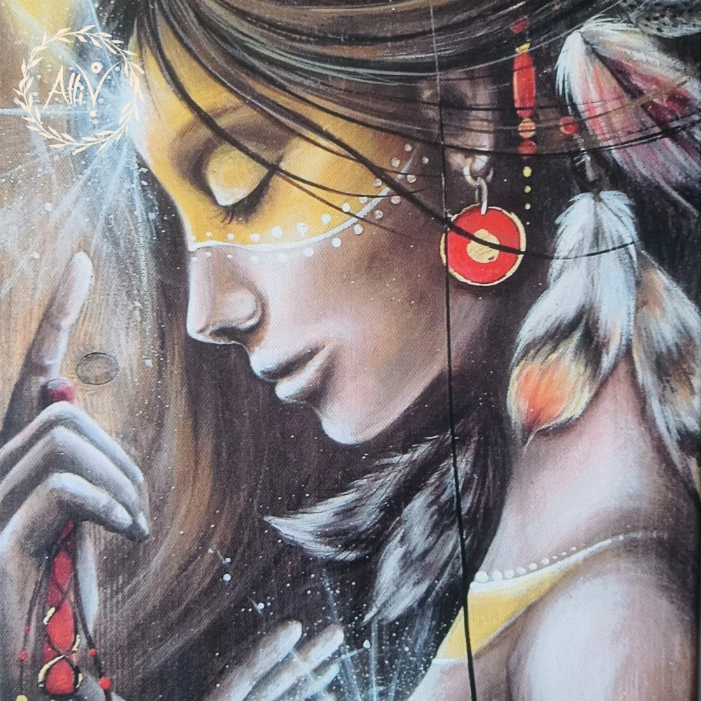 Šamanka na obraze ukazuje na čelo, ze kterého vyzařuje světlo, a nad ní vylétá káně – symbol svobodné myšlenky a síly ducha. Tento obraz pro mě zosobňuje volnost, jasnost mysli a odvahu důvěřovat své intuici.